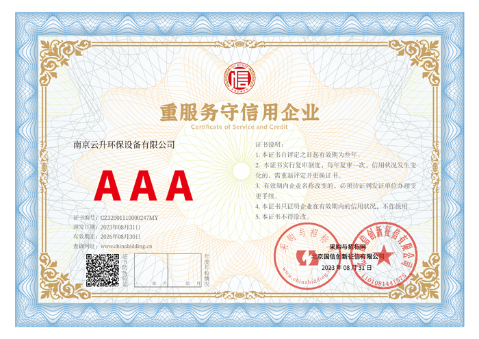 南京云升環(huán)保設備有限公司全體員工愿以環(huán)境保護為己任,以市場為導向,以優(yōu)質(zhì)服務為原則,嚴格的管理、先進的生產(chǎn)工藝、至上的品質(zhì)、完善的售前售后服務,與廣大新老用戶攜手并進,共鑄輝煌。公司已通過ISO9001:2000質(zhì)量管理體系標準認證,成為江蘇省高新企業(yè),并進行不斷的技術(shù)改進和創(chuàng)新,為客戶和合作伙伴提供滿意的產(chǎn)品。